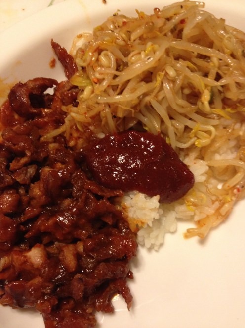 I had some bean sprouts and spicy pork. I was missing eggs over easy for this dish but was ok without it (Probably a bit more spicier). We mix it a spicy red pepper paste sold in Korean markets and sesame oil. My husband would add in soy sauce.