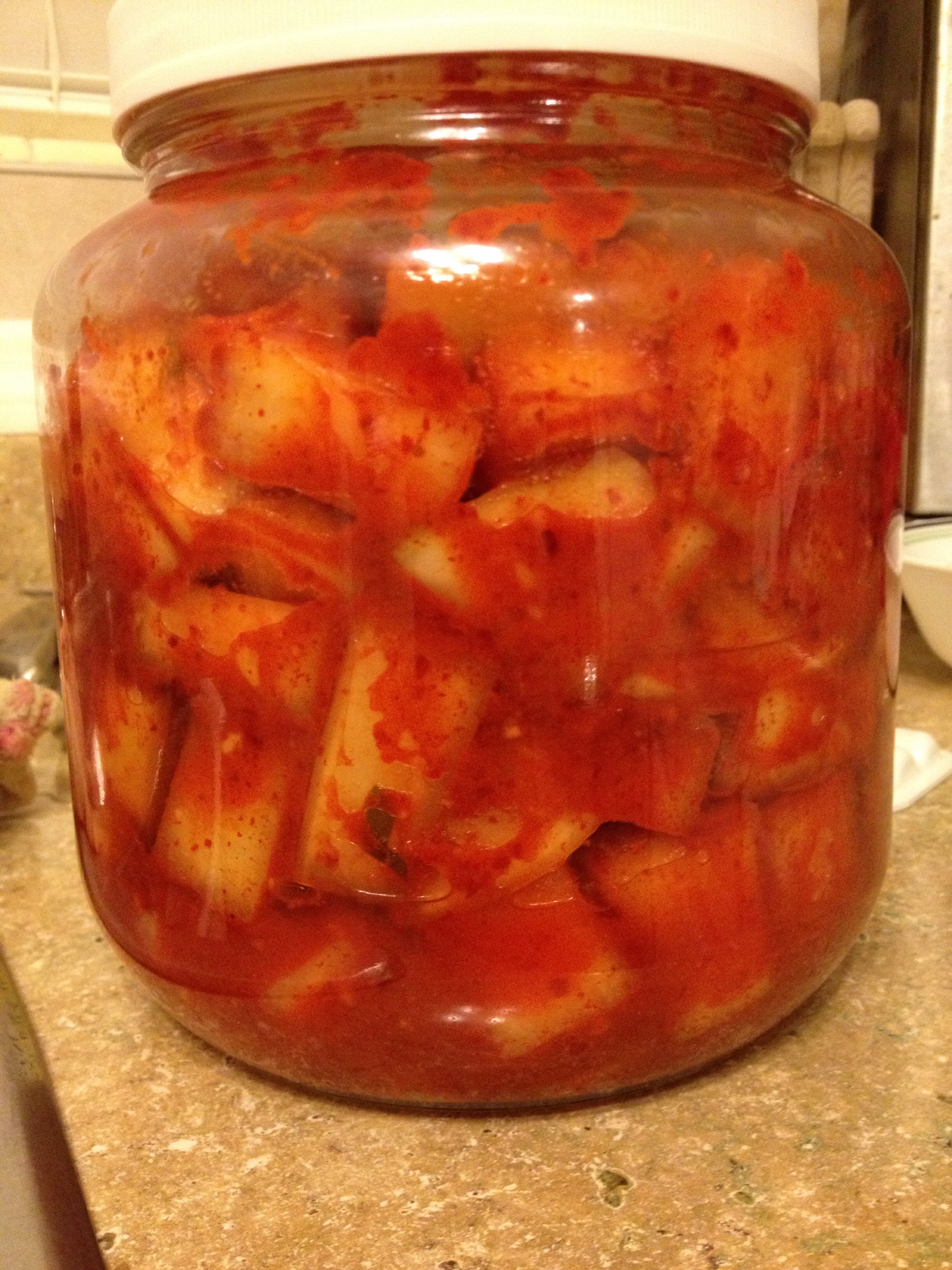 Just made some fresh mu(daikon or also known as radish) kimchee. It needs to ferment before we dig into it. I like to let it ferment in the fridge so it will take longer. I have not had much luck when I let it ferment on the counter.
