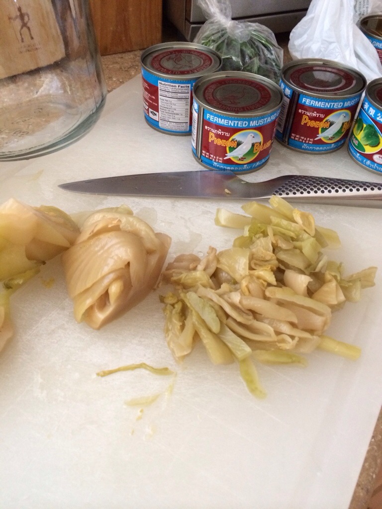 Throw the juice of the fermented mustard cabbage into a container you want to make it in. I used two half gallon jars.